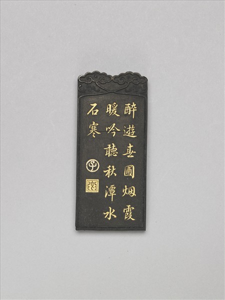 長方形墨,以模印製作圖紋,上方作二線條式如意雲紋,下襯雙蝠,由雲紋下延伸二線條,交錯後連至兩側,至底部相接,形成邊棱,一面有填金行體陰文「醉游春圃烟霞暖,吟聽秋潭水石寒」,及篆體「子」、「卿」印文;一面左上方有填金草體陰文「睢陽五老」,中央畫面中模印一老者坐靠於溪邊石上。睢陽五老是北宋仁宗時睢陽當地五位德高望重的致仕官員:太子太師致仕祁國公杜衍、禮部侍郎致仕王煥、司農卿致仕畢士長、兵部郎中致仕朱貫、駕部郎中致仕馮平,五位耆年歸鄉後,由杜衍為首於暇日集會,賦詩酬唱,為五老之會,為當時人所仰慕,繪為圖畫以紀其勝,成為畫題之一。本墨為(睢陽)五老圖墨之一,與贈文000032N000000000~贈文000032N000000002、贈文000032N000000004為一組共儲一盒。