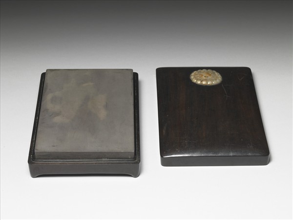 淺灰色端石硯,呈長方形,器表光滑,平素無紋飾。附一木製硯盒。