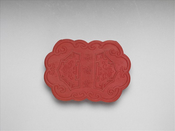 紅色墨,外廓卷草紋棱起,故輪廓表現為連續之弧起。一面正中央模印「品詩堂」楷字,其字兩側各有一近山形開光,開光內各有蓮花一朵。另面模印齋室一隅,案上書卷文具,不遠處有盆景,室外一邊有湖石並峙,應是描模「品詩堂」之景。墨側「乾隆甲子年(九年,1744)」、「曹素功謹製」楷字,但「謹」字較不明顯。