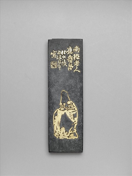 長方形墨,一角裂開,墨面模印之圖樣與款銘多填金。一面為南極仙翁,由模印圖像仍可見所據母本的用筆速度感,南極仙翁上方則為「南極老人應壽昌」、「杜少陵句任伯年寫」行書題銘款識,可知此圖像之創作者為大畫家任頤(1840-1895)。另面為「仁者壽」、「胡公壽題」行書字樣。墨側之「徽城老吳開文法製」楷字是唯一不見填金者,墨頂有「超貢漆煙」隸字。