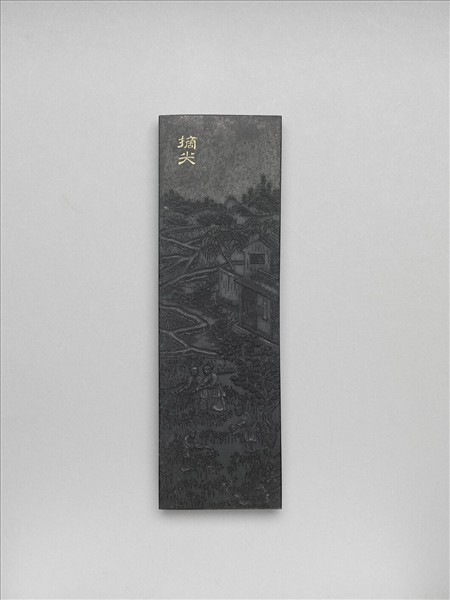 長方形墨,一面浮雕摘尖圖,有填金隸款「摘尖」,另一面作填金回紋邊框,內有填金行書摘尖詩並記,詩云:「尖去條抽始暘然,趨晴避雨摘炎天,愛之能勿勞乎爾,萬事由來一理詮」。墨頂面並有「兩淮貢墨」楷字。棉花圖墨乃描繪棉花從佈種到織布的工序圖。
