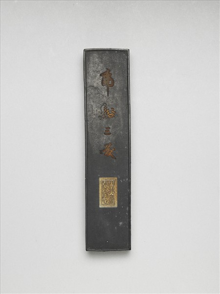 長方形墨,邊框起棱,一面模印「虎谿三笑」填金草字,並模鈐「西井齋監製」。另面即模印東晉陶淵明、陸修靜、慧遠相與送行至虎谿的韻事,可見三人正互動於流水之前。墨頂面有「西井齋」楷字,墨側「徽州磐石氏監製」楷書款字。