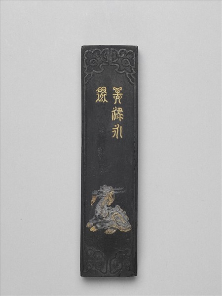 長方形墨,面上首尾各棱起雲紋,一面模印異獸蹲伏,並以金銀二彩裝飾獸身,異獸上方「天祿永保」填金篆字。另面則為填金「李氏珍藏」四字,墨側有「徽州詹彥文製」楷字款識。