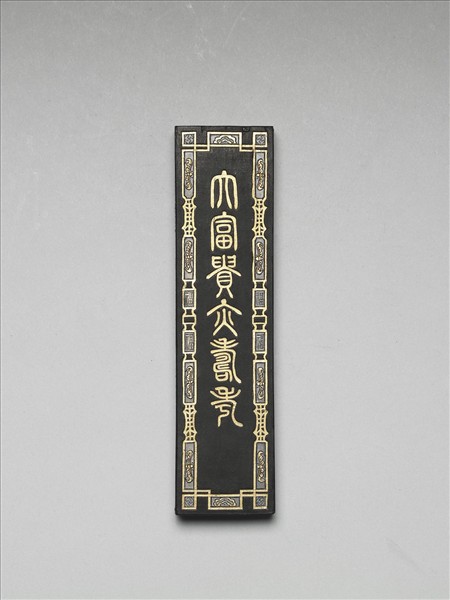 長方形墨。一面填金「大富貴亦壽考」篆字,邊廓飾有蝙蝠即「福」字,皆以金彩裝飾,光彩耀眼。另面金色方框,內模印一人立於馬旁,並像左上方的雲間天女拱手,圖像用銀、金、綠、紅等多種顏色裝飾。墨側有「同治丙寅(五年,1866)岑川程氏珍藏」、「徽州屯鎮老胡開文監製」填金篆字款識。此墨一式兩件,同成一組。