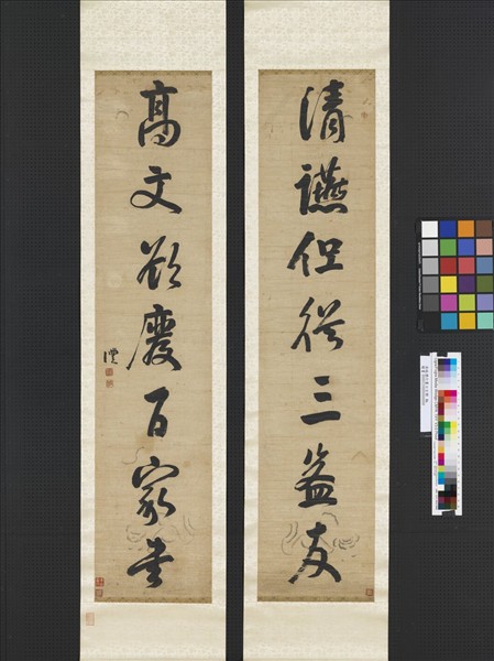 錢灃(1740-1795),字約甫,號南園,雲南昆明人。乾隆三十六(1771)年進士,曾任監察御史、提督湖南學政等職,有詩文集流傳於世。書法以善學顏真卿著稱於世,楷書結體平正,筆力厚實,能得顏書穩重的氣度,近人學顏字多從錢灃入手。 本件行書七言聯,文云:「清讌但從三益友。高文欲慶百家書。」結體勻稱寬博,用筆豐厚沉穩,得力於顏魯公草稿行書。 李宗黃先生捐贈於民國66年。(20110204)