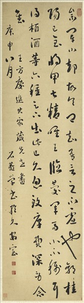 劉墉(約西元一七一九—約一八0四年),字崇如,號石庵,山東諸城人。官至體仁閣大學士。諡文清。工詩文,擅書法,初法魏晉,筆意古厚,中年後乃自成一家,超然獨出。萬歲通天二年,武則天向王方慶徵集王羲之墨迹,遂將所藏先祖王導等二十八人書共十卷獻出,武則天命人全部雙鈎廓填,〈萬歲通天帖〉即十卷之一。此作雖節臨其中文字,劉墉書來圓潤婉轉,筆觸輕重變化靈動,已是個人面貌。(20110710)