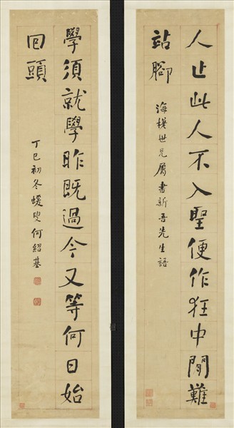何紹基(西元一七九九─一八七三年),字子貞,號東洲,晚號蝯叟,湖南道州人。他學書由篆隸入手,畢生受顏真卿影響,晚年則隸篆真行融為一體。 此幅對聯「人止此人不入聖便作狂中閒難站腳,學須就學昨既過今又等何日始回頭。」書於五十八歲,有顏楷渾厚的體勢,行筆用中鋒而微顫,線條外柔內剛,篆隸底蘊深厚。結字從容,斷筆處有古趣,連筆處活潑靈動。本幅為譚氏兄弟捐贈。