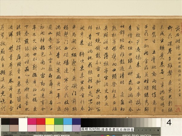 查昇(一六五○-一七○七)字仲韋,又字聲山,浙江海寧人。康熙二十七年進士,官至詹事府少詹事兼翰林院侍講學士。查氏為官恭謹,深得康熙皇帝信任,書法循王羲之傳統,入於米芾、董其昌之間,尤得後者神韻,深受康熙皇帝嘉賞。 這卷行書書錄宋范成大〈四時田園雜興〉二十五首,由其秀美流暢之書風,可見董其昌書風的影響,為康熙時期帖學派代表之一。本幅為李石曾先生捐贈。(20100102)