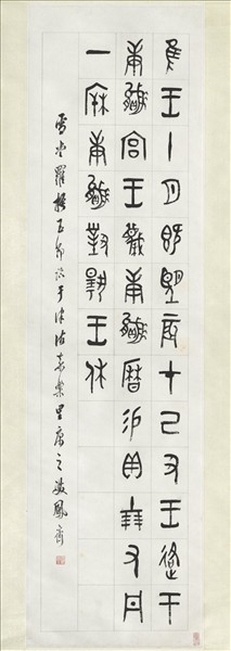 清代書壇,學者書法家的成就光華四射,羅振玉便是其中之一。 羅振玉(一八六五-─九四O),字叔言,號雪堂,浙江上虞人。當年甲骨在河南安陽小屯出土的時候,羅振玉首先探出來由,考訂出安陽便是晚商國都所在,確認甲骨文字歸屬的時代。羅振玉畢身研究學問,對古文字學貢獻卓越,學術界尊為甲骨學四大學者之一。 羅振玉著作豐富,遠非常人所及;書藝方面的成就,也教人贊歎不已。由於具有古文字學深厚的學養,甲骨文、金文、小篆寫來得心應手。這幅書法臨寫秦詔版小篆,結體勻整,點畫位置妥貼,可以推許為小篆的典範。