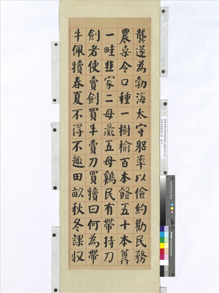 何紹基(一七九九~一八七三),字子貞,別號蝯叟,湖南道縣人。道光十六年進士,曾任翰林院編修,先後在山東、湖南、浙江等地講學,有詩文集流傳於世。何氏書學根基深厚,從顏真卿楷書入手,同時臨習古文字、漢隸、北碑,日久熟悉各家筆法,寫出屬於自己的風貌。這幅楷書摘錄《農桑輯要》先賢務農治理地方的經驗,筆意深得顏體淳厚的氣息。本幅為何應欽將軍捐贈。(20120409)