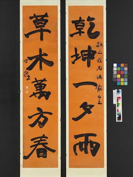 于右任(西元一八七九—一九六四年),陜西三原人,清季加入同盟會,民國二十年以後任監察院長,擅書法、詩文。于右任書法早期根植北碑,體勢魁偉,並參入木簡,別具神韻,中年以後轉方為圓,並倡「標準草書」。本聯「乾坤一夕雨,草木萬方春。」結字圓潤醇厚,不露使轉之跡,有楷書的端正卻有草書的速度,首聯的「乾」字筆劃中有章草之意,質樸豪邁,氣象沉雄。本幅為何應欽將軍捐贈。