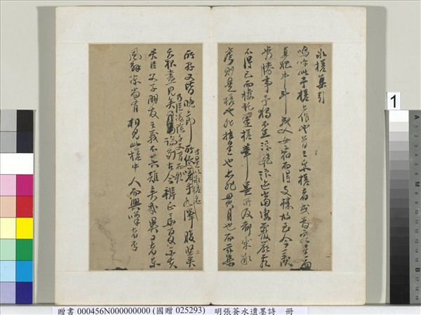 張蒼水(一六二○〜一六六四),名煌言,字玄箸,號蒼水,浙江鄞縣人,崇禎壬午(一六四二)舉人。以舉人奉表迎魯王監國,並從監國駐海外舟山。一六六二年魯王薨,一六六四年煌言遁居懸嶴,為清兵所襲,被執不降而死。今有《張蒼水集》行世,內收《冰槎集》、《奇零草》、《北征錄》等詩文。 本冊為張煌言遺墨詩及〈冰槎集引〉,詩多流露忠義悲憤之情。遺墨詩之後則有友人揮淚寫及,張煌言被羈杭州時致贈此稿。 張水娟女士捐贈於民國七十八年。 (20120106)