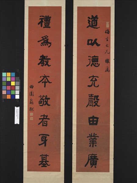 曲園居士俞樾(一八二一―一九O七),浙江德清人,道光年間考中進士以後,一度任職翰林院編修、提督河南學政。四十歲以後選擇教書工作,在江浙一帶書院講學,從此專心研究學問,到老仍然手不釋卷。數十年教學相長,俞樾不但桃李滿天下,在學術上的成就也相當可觀。 俞樾也是清代學者書法家的代表,他的隸書融合楷書的質素,有橫平豎直端凝的氣質,卻不覺得刻版單調;結體近於方正,內歛含蓄,沒有鋒芒畢露的銳氣。這幅對聯不僅書法值得欣賞,文字內容也深具意義,令人體會到俞樾深受儒家思想薰陶,不止於重視求學問,也同時重視品德修養。