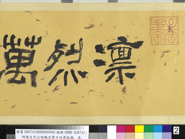 楊漣(1572-1625),湖北應山人,字文孺,號大洪。天啟四年(1624),以御史身份彈劾宦官魏忠賢,文記三月書,六月上書,越年七月二十四日冤死。 此幅以行書寫成,凡三千二百八十字。書寫時憂心國家大事,扼腕流涕,無意求工,反覺渾樸自然。書如其人,人品既高,字格必高,可比之顏魯公〈祭姪文稿〉,又〈疏稿〉可補史之闕文,可謂文辭與書翰並美。 秦孝儀先生捐贈於民國88年。(20110204)