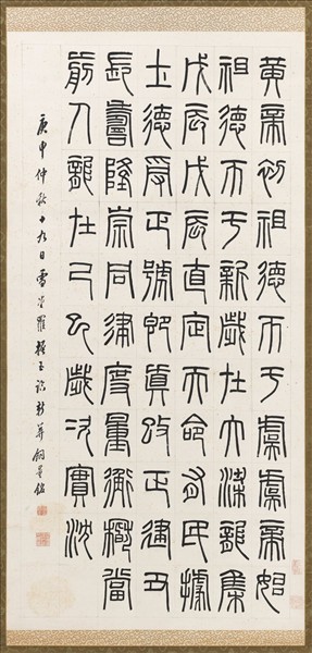 羅振玉(西元一八六六-一九四0年),字叔蘊,號雪堂,浙江上虞人。清末入京為學部參事官,辛亥革命後赴日,曾任職偽滿州國。早年書學顏真卿,後致力古文字研究,多見鼎彝碑版,書法醇厚古樸,甲骨、金文、小篆、漢隸、行楷,無不典雅有致。 此幅為羅振玉五十五歲作品,結體勻整,墨色濃淡佈置自然,點畫位置妥貼,可為小篆的典範。選自林宗毅先生林誠道先生父子捐贈。(20091015)