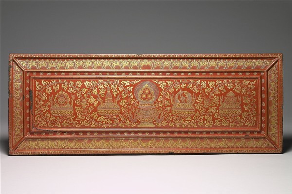 長方形經板,二片一組,經書上下的護板。封面一片的背面中央陰刻填金一蓮瓣形龕,龕內書藏、漢文:「律師戒行經第六品/分別戒律品」。經板,中間較兩側厚,面作圓弧形,側面飾獅面唐草文,板面為三重長方形,二、三重的對角以斜線相連,框線高起。主要紋飾為外層一圈蓮瓣與長方形內的八寶。八寶置於轉枝番蓮紋相連的蓮座上,中央的寶瓶座上置三如意寶珠,光芒四射,向左右伸出枝葉,由左而右分別為法輪、傘蓋、雙魚與寶瓶,另一片底板則飾傘蓋、寶螺、蓮花、盤長,共同形成八寶。漆色紅潤,漆層實,金色耀眼,戧金地陰刻細密工整,圖案勻淨,氣度莊嚴。與贈漆11為一組。
