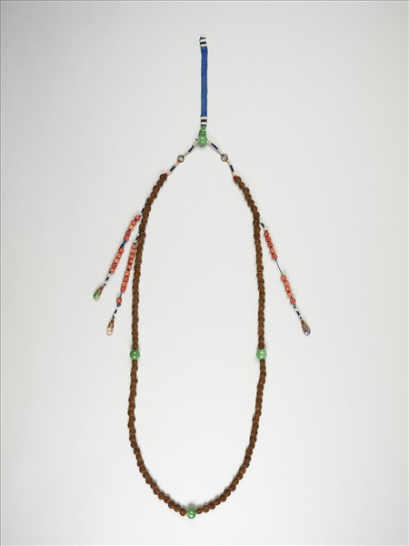 核桃,色澤深褐,表面粗糙。整個朝珠串由一百零八粒核桃珠貫穿而成,每隔二十七粒穿入一粒稱為「佛頭」的大珠,與垂于胸前正中的一粒佛頭相對的則稱為「佛頭塔」,皆為翠玉。在佛頭塔兩側綴有三串小珠,每串小珠十粒珊瑚,名為記捻。朝珠源自數珠,是清代君臣、后妃、命婦穿著朝服或吉服時,垂掛在胸前象徵身分地位的飾物。