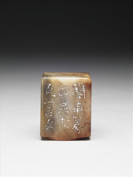 白色石,間雜褐與赭色斑紋。全器琢呈一方形印章,印面方正,雕刻「言顧行顧」四陽刻字,以圓形循環方式呈現,字中間包圍一圓形。印面仍可見殘留朱紅印泥。印身兩面分別陰刻邊款「言顧行,行顧言」、「蘭甫篆命昆玉仿瓦當文」。何昆玉(1828-1899),字昆玉,為陳蘭甫嫡傳弟子,精於篆刻。