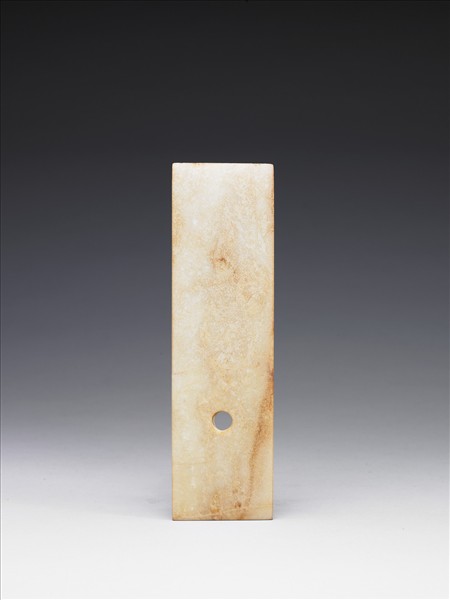玉質,泛赭斑。全器作長方形,刃部平直,器身下半部有孔。四邊緣切割整齊。