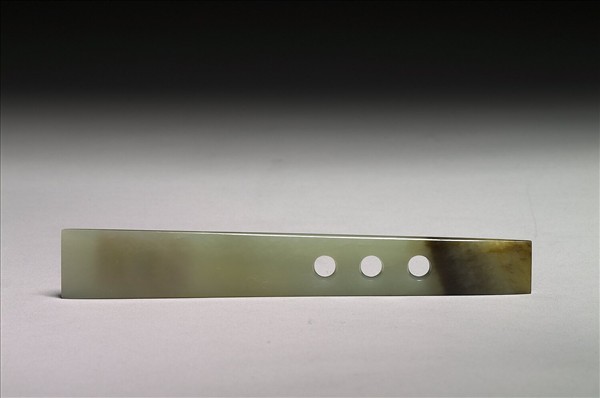玉質,局部有赭沁斑,表面泛有玻璃光,光素平滑。全器作長梯形,刃部略寬、背部略窄,器身靠近下端處有三孔。