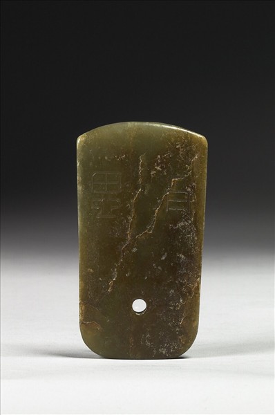 玉質,帶有大片赭沁色,表面拋光。全器略呈長方形,器身下半部有孔,背部兩端作圓弧。