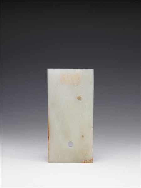白玉,有白綹及赭斑紋,局部有赭沁。全器略呈長方形,刃部平直,器身下半部有孔,孔作單面鑽。四邊緣切割整齊。