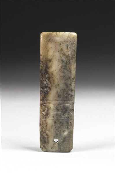 白玉,帶有大片灰斑與深赭沁色。全器略呈長方形,刃部鈍直,器身下半部有孔,器身淺浮雕有不規則幾何雲紋。