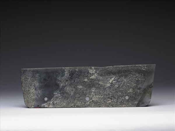玉質,帶有白斑。全器呈不規則梯形,器身上有三孔,位置較偏邊緣,上端為刃部,作中鋒。
