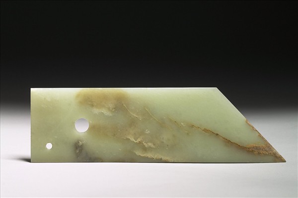 玉質,有片狀白斑及赭色裂璺。全器做不對稱梯形,刃部為斜直線,柄部平直。器身下半部有大小兩孔,大孔位中央,小孔較偏邊緣。