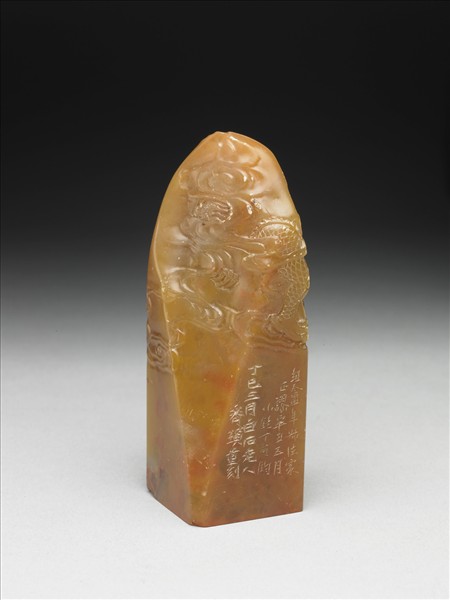壽山石章,黃色間雜局部紅色。長方體,頂呈不規則形,一大斜面縱貫器身,印面方正。印面陰刻四字篆文:「延闓之印」,「延」字右上敲邊,「延」、「闓」依筆劃多寡自然挪讓,「之」與「印」一屈一伸一如「延」、「闓」,「印」拉長的上部和「闓」字中間「山」的傾斜相互應,不失為巧妙之舉。邊款:「祖盦年叔法家正謬。辛丑(光緒二十七年,1901)五月。小鈍丁可鈞。」「丁巳三月。白石老人齊璜重刻。」由邊款可知此印原有丁可鈞辛丑年刻文,後齊白石磨去,被重刻。印身薄意雙龍雲紋,雙龍各據一面相互對望。