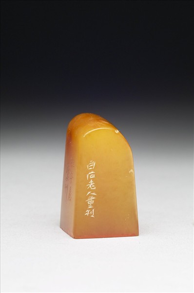 田黃石章,黃色,無裂痕,石質溫潤。長方體,頂呈斜面,印面正方。印面陰刻二字篆文「延闓」,筆劃方折,豎畫背勢,篆字重心置上。邊款:「白石老人重刻」,「組安屬。鯨士刊。」可知此印由齊白石落刀重製,原由譚延闓請鯨士刻製。附布套。
