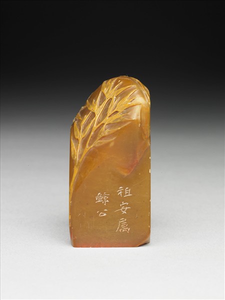 田黃石章,黃色有深有淺。長方體,頂呈斜面,印面正方。印面陰刻四字篆文:「慈衛室印」,四角刻圓,印面的左上角殘破。連續兩面巧色薄意竹紋,紋飾色澤較淺,竹枝有聚有散,竹葉朝上,左右兩邊為向勢。邊款左右各一:「組安屬。鯨公。」、「白石老人重刊」。附布套。