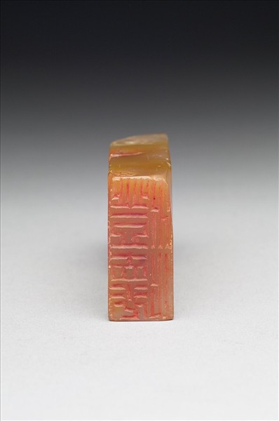 壽山石章,橙赭色中透黃色。長方體,印頂呈不規則形,印面長方。印面陽刻二字篆文:「澄懷」,遒勁穩健,左上方缺邊。邊款:「辛丑十月為組安兄弟三人作。鯨士仿丁居士法于長沙。」從邊款可知此印由鯨士所治。印身琢飾一對海龍上下互望。