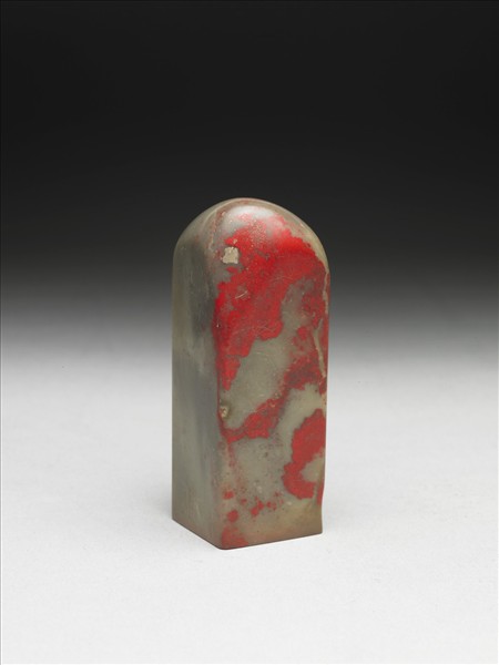 雞血石章,以石間有雞血色斑紋而有此名稱。長方體,印頂呈一側斜面,印面長方。印面陽刻四字篆文:「組安書畫」。此印與另一雞血石印文為「茶陵譚延闓印」的印(贈玉65)為對章。