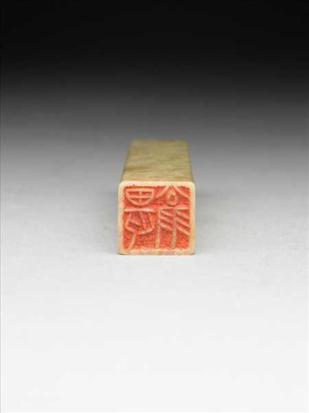 青田石章,綠豆仁色,略帶赭色斑。長方體,印面正方。印面陽刻二字篆文:「畏翁」,字細。此印與另一印文為「譚延闓」的印(贈玉67)為對章。