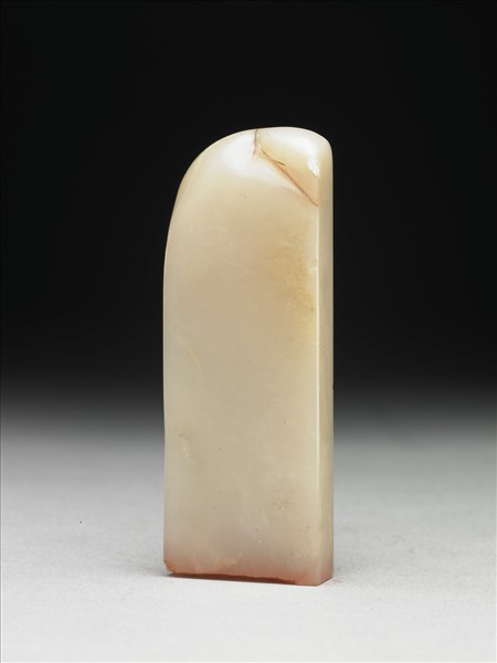 青田石章,色白。長方體,印頂呈不對稱弧度,印面長方。印面右下挖去一片,並陰刻圖案化龍紋。印身淺浮雕人物樹景。