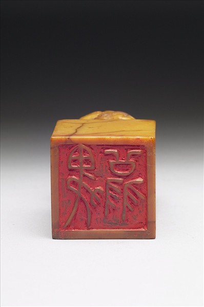 壽山石章,栗黃色,帶褐斑。正方體,印面正方。印面陽刻二字篆文:「畏翁」。邊款:「擬古璽。叔孺製。」叔孺是印人趙時棡的號,由此可知此印為趙時棡仿效古印璽所刻。鈕立雕二小一大獅共三隻。此印與另一印文為「譚延闓印」的印章(贈玉74)為對章。