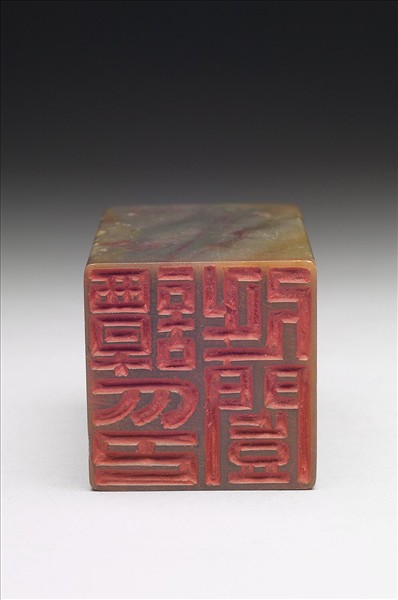 昌化石章,灰綠色中微露赭、白色斑。長方體,印面正方。印面陰刻四字篆文:「譚延闓印」。邊款:「組安先生命刻。李尹桑。」可知此印為印人李尹桑所治。與另一印文為「組安」的印章(贈玉75)成對。