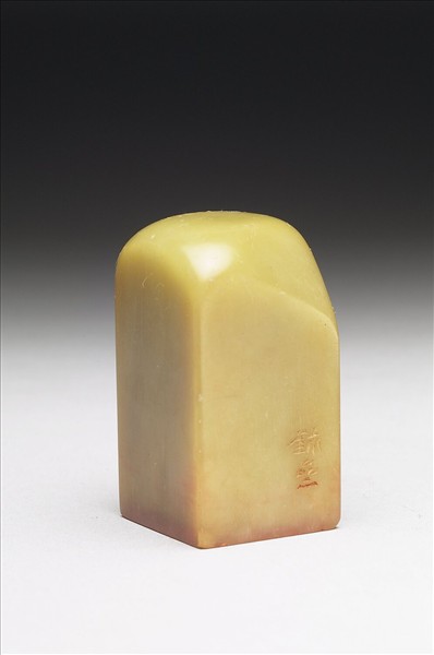 青田石章,青黃色。長方體,頂作不規則形狀,印面正方。印面陽刻二字篆文:「祖安」。邊款:「鈢齋」,鈢齋即印人李尹桑。此印與另一印文為「譚延闓印」的印章(贈玉84)成對。附布套。