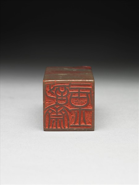 雞血石章,以石間有雞血色斑紋而有此名稱。長方體,印面正方。印面陽刻四字篆文:「訒齋居士」,多運用弧線結字。邊款:「康侯製。」此印為印人馮康侯所治。