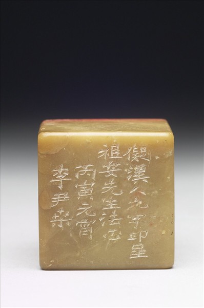 青田石章,淡黃色。正方體,印面正方。印面陰刻九字篆文:「茶陵譚延闓字祖安印」,佈局工整。頂款:「儗漢人九字印。呈祖安先生法正。丙寅元宵。李尹桑。」此印為印人李尹桑所治。附布套。