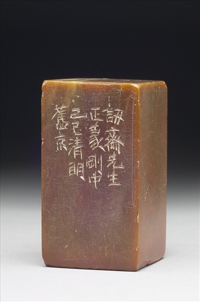 壽山石章,褐色。長方體,印面正方。印面陽刻四字篆文:「譚延闓印」。邊款:「訒齋先生正篆。剛中。己巳清明。舊京。」此印為印人鍾剛中所刻。附布套。
