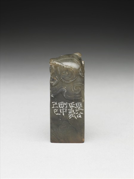 壽山石章,淡墨色。長方體,印面正方。印面陰刻四字篆文:「譚延闓印」,刀痕可見,字與字相連,佈滿印面。邊款:「畏公正篆。剛中。己巳。」由邊款可知此印作者為鍾剛中。印身上部薄意雲龍紋。