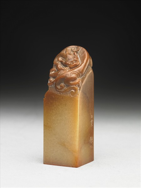 壽山石章,黃赭雙色。長方體,印頂呈斜面,印面正方。印面陰刻四字篆文:「祖安手鈔」,以十字界線分隔,布局平穩。邊款:「壬寅。鯨士。」由邊款可知此印為鯨士執刀所刻。印頂浮雕一龍蟠踞。