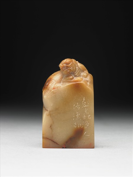 田黃石章,黃赭色夾雜。長方體,印面長方。印面陽刻四字篆文:「玉連環室」。邊款:「彭蠡漁人仿漢印」。鈕雕獅形。