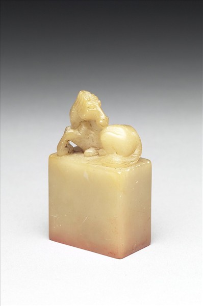 青田石章,淡黃色。長方體,印面長方。印面以界線均分六等份,隔線內陽刻篆文:「譚祖安藏閱書」。邊款:「祖安屬。辛丑。鯨老。」辛丑為清光緒二十七年(1901)。鈕雕馬形,呈跪臥回首之姿。