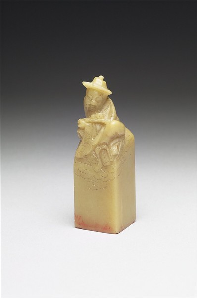 青田石章,黃中帶綠。長方體,印面正方。印面陰刻四字篆文:「組安書記」。邊款:「組安壬寅印。鯨士。」鈕立雕仙翁,盤腿而坐,身體攲側,頭戴帽,帽沿寬而外翻,神情自若,器身上部陰線刻雲紋,增添仙境之感。