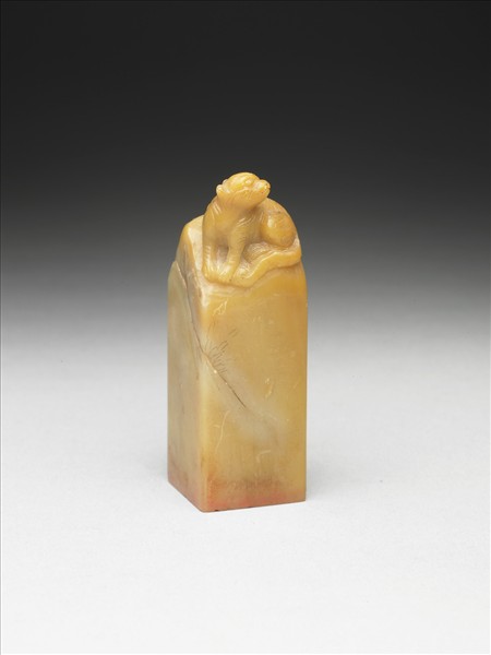 青田石章,深淺不一的黃色,有裂紋。長方體,印面正方。印面陰刻四字篆文:「延闓長壽」,線條渾圓。鈕雕虎形。