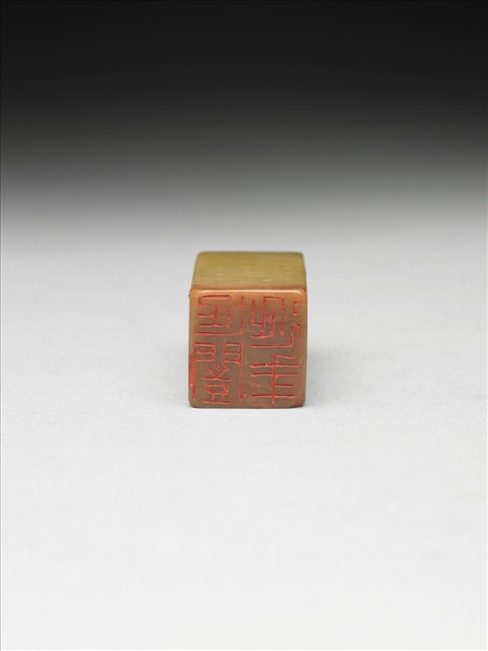 青田石章,土黃色。長方體,印面正方。印面陰刻四字篆文:「延闓延年」。附布套。