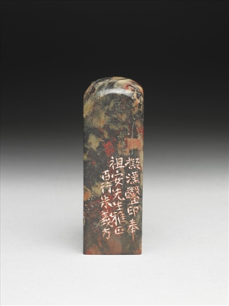 壽山石章,大部分為黑色,夾雜紅色、白黃色斑。長方體,圓弧頂,印面正方。印面陰刻四字篆文:「譚延闓印」。邊款:「光緒丁未嘉平月髣漢鑿。頗得古法。組盦老叔同年法家以為何如。時客長沙臬署。可鈞。」「丁末後十二年丁巳四月白石老人齊璜重刊」「擬漢鑿印。奉組安先生雅正。百行朱義方。」從邊款來看,此印原為丁可鈞所刻,後為齊白石、朱義方重刻,珍稀之玉石常被重複刻作。
